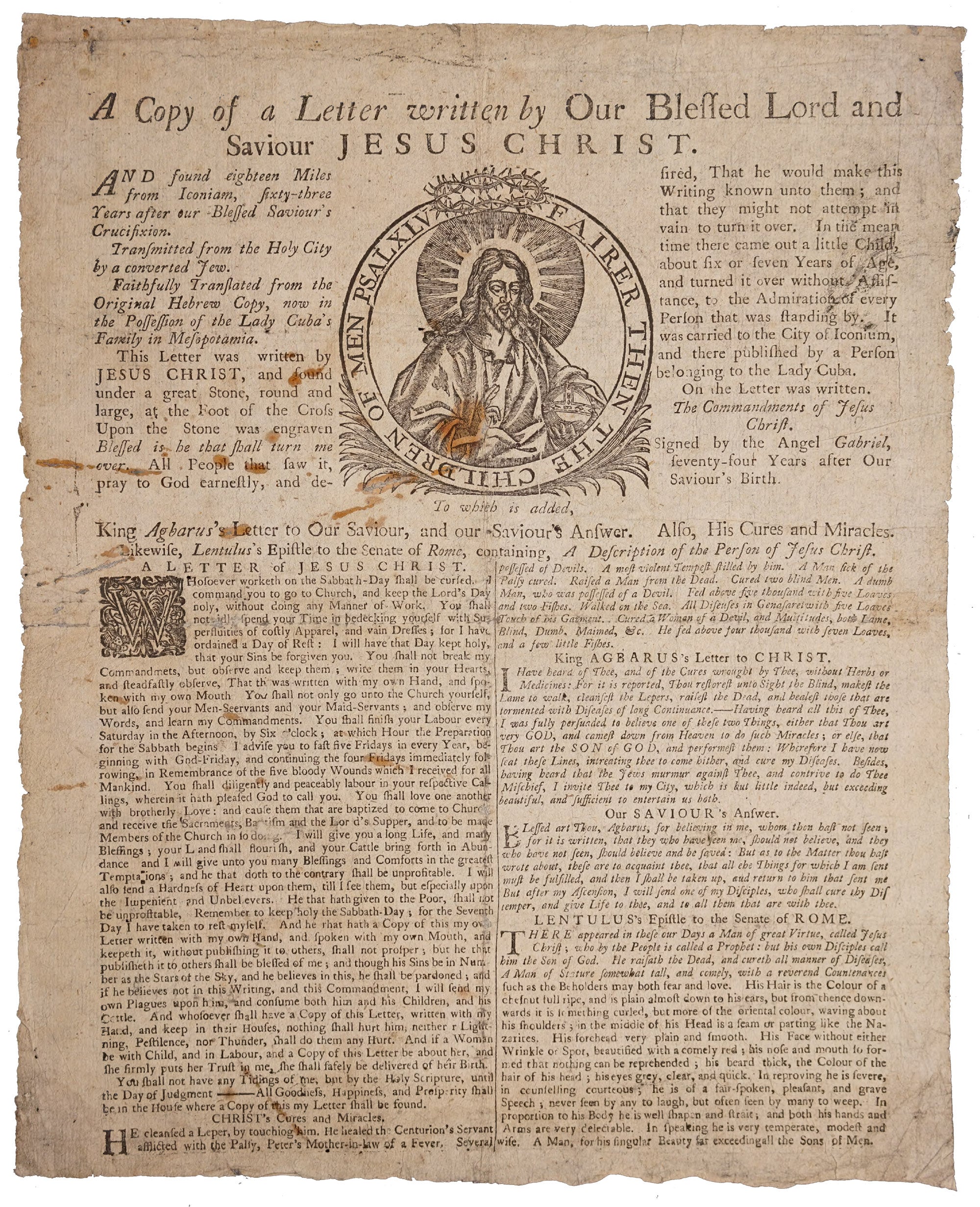 So, the letter is sent down to earth sixty-three years after Christ’s crucifixion and placed under a large rock in the holy land with an inscription on top: “Blessed is he that shall turn me over.” People saw this strange-looking rock and tried to pick it up, but none could until this innocent little boy succeeded, delivering it to authorities. In the letter itself, Jesus has given the proviso that “he who copyeth this letter shall be blessed,” but “he that that destroyeth this letter will be cursed.” It’s possibly the first chain letter in history, thought to date originally to the sixth century. We have broadsides of the Letter printed in the late eighteenth century in the collection!
