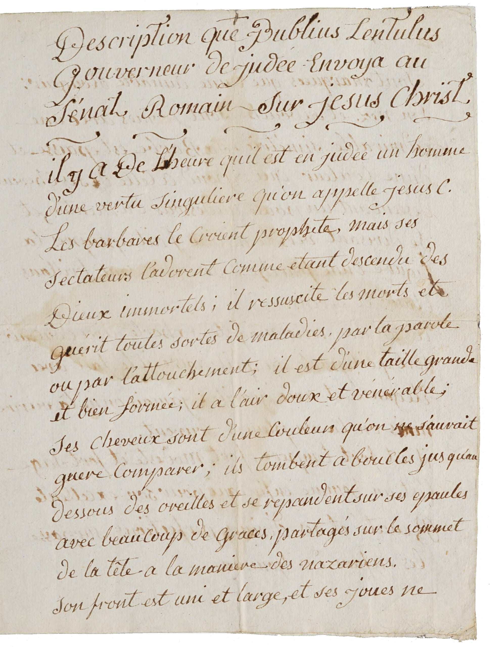 This always floors people: the Bible doesn’t actually tell us what Jesus Christ looked like. At all. But there have literally been billions of people over the past two millennia who would have liked to know this. So, in the Middle Ages, somebody decided to fix that, and they wrote the Letter of Publius Lentulus, a fake epistle supposedly written by a Roman in Palestine who was an eyewitness to Jesus’s activities. He ostensibly wrote to the Senate in Rome describing Jesus as having chestnut hair, smooth at the top and curly down to his shoulders, with gray eyes and no blemishes. That’s preserved in over 300 medieval and Renaissance manuscript witnesses and has served as the basis of untold thousands of visual representations of Jesus Christ.