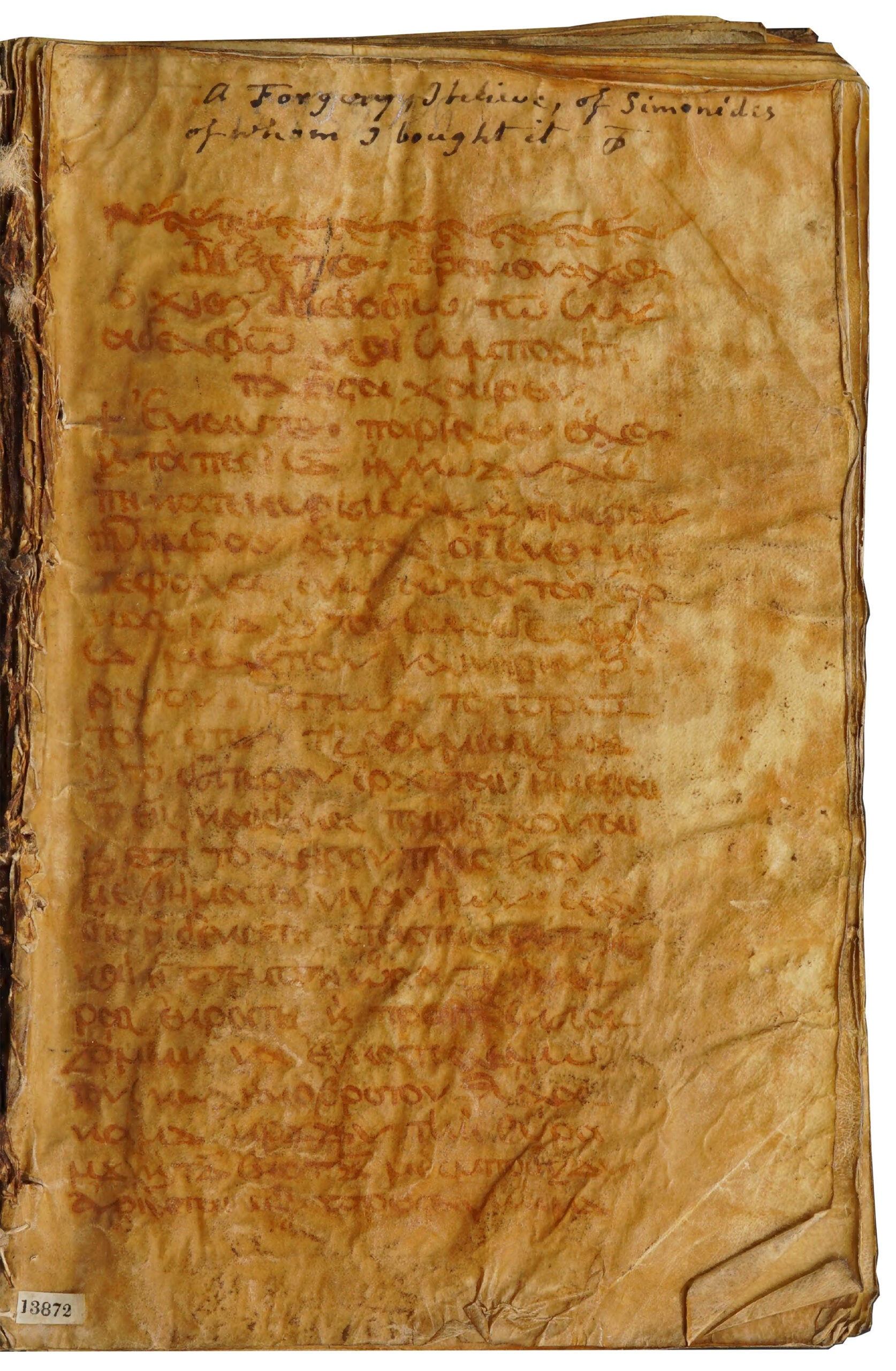 We have an ancient Greek manuscript that was written by Constantine Simonides in the nineteenth century revealing the lost secrets of Greek painting in late antiquity. It was bought by the most famous collector of the era of bibliomania, Sir Thomas Phillips. He later wrote on the first page that he bought it knowing it was fake…but who’s to say?