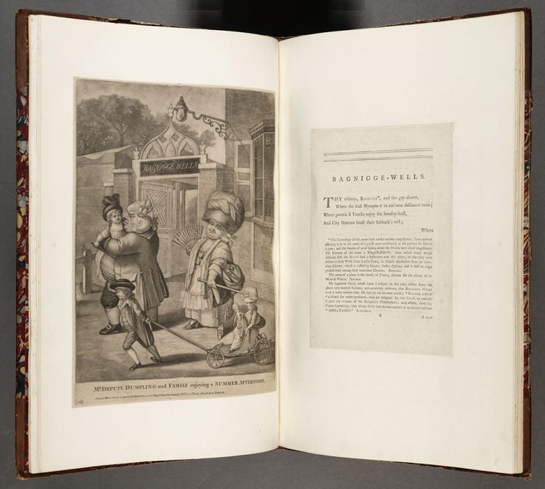 Other Grangerized editions became monuments to the history of the book itself. One copy of Gil Blas, a French-language novel set in Spain, was apparently augmented over several decades, doubling its original four-volume length. The new material included title pages and illustrations from both previous and later additions, as well as less obviously relevant material. One addition was a lithograph of an elegantly dressed young woman. Its title, “Espagnole,” referred to a French idea of a Spanish fashion, mirroring the novel’s transnational heritage.