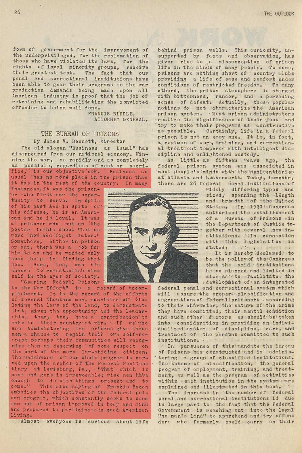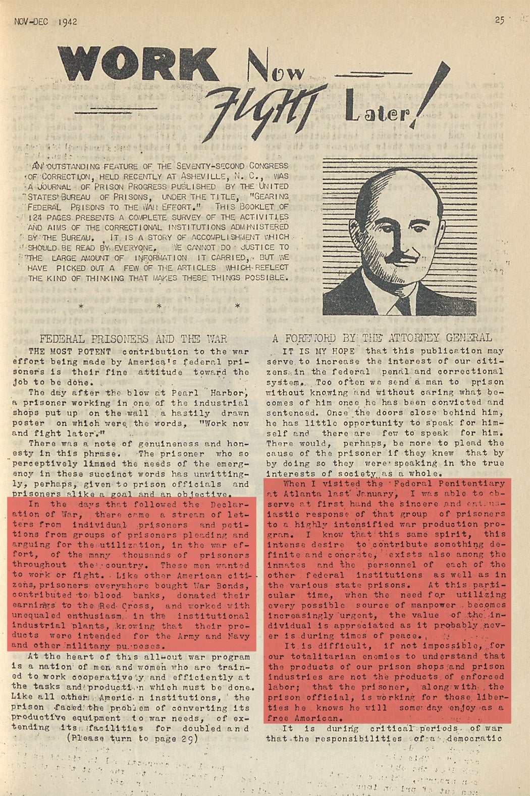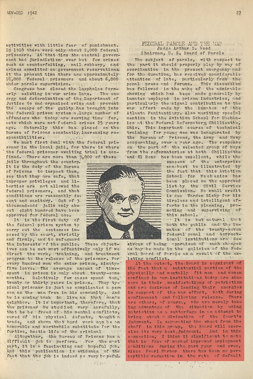 While prisoners’ contributions to the war effort were mostly forgotten to history, they were formally recognized at the time by many national leaders, including then-Attorney General Francis Biddle, Director of the Bureau of Prisons James Bennett, Chairman of the US Board of Parole Judge Arthur Wood, and a resolution at the 72nd Annual Congress of Correction, published in The Outlook out of the federal reformatory in Oklahoma. Judge Wood, Chairman of the Board of Parole, cautiously commends the pleas of prisoners to be allowed to “work or fight”: