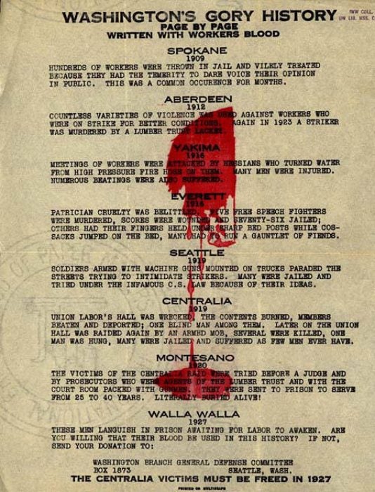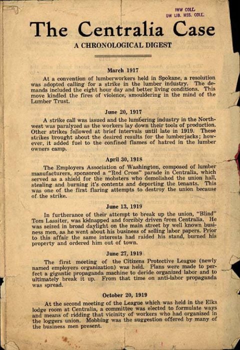 On November 11, 1919, tensions came to a head between members of the Industrial Workers of the World (IWW)—known as the Wobblies—and members of the American Legion in Centralia, Washington, at the first Armistice Day parade after World War I. The conflict between the two groups was deep-seated. The American Legion had been chartered as a patriotic veteran’s organization just after the war. Meanwhile, the IWW had opposed U.S. participation; it was the only American labor organization to do so. A fatal confrontation between the two parties began when, as documented in the IWW’s The Centralia Case: A Chronological Digest, “an armed mob charged on the [Wobblies’] union hall from the rear rank of the Armistice Parade.” Legionnaires Warren Grimm, Arthur McElfresh, and Ben Casagranda were killed in the initial blow between the Legionnaires and the Wobblies.