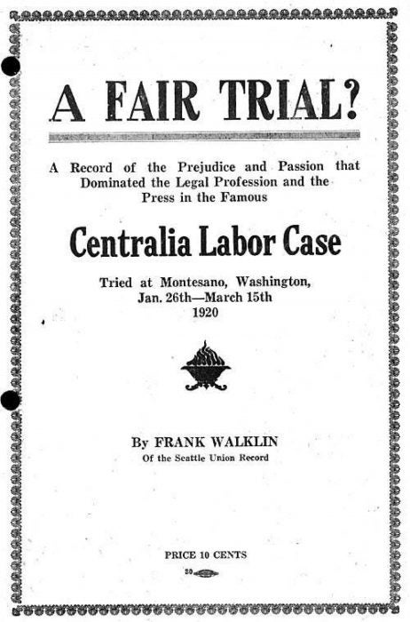 On January 26, 1920, the trial against the Wobblies began in Montesano, Washington, overseen by Judge John Wilson. Journalist Frank Walklin of the Seattle Union Record—a union-owned newspaper that was raided by U.S. agents after the Centralia Tragedy—published his first-hand account of the trial in the pamphlet A Fair Trial? Since the trial judge excluded some portion of the Wobblies’ evidence, this pamphlet helped illustrate why the Wobblies’ believed that the Centralia tragedy and its aftermath was a conspiracy against the labor movement.