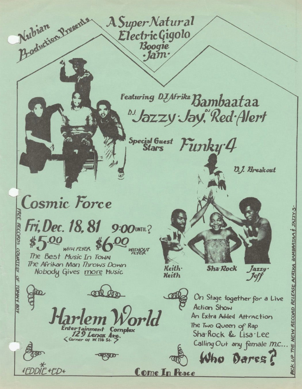 In the Cornell collection, which began as a donation of material that hip-hop historian Johan Kugelberg collected while writing Born in the Bronx, you can also find flyers by Eddie Ed, whose work often included cutout photographs, portraits, and playful cartoons of the luminaries of the hip-hop scene, and Anthony Riley, whose eye-catching designs made bold use of black backgrounds. “Riley’s flyers get brothers to think,” Melle Mel of Grandmaster Flash once said.
