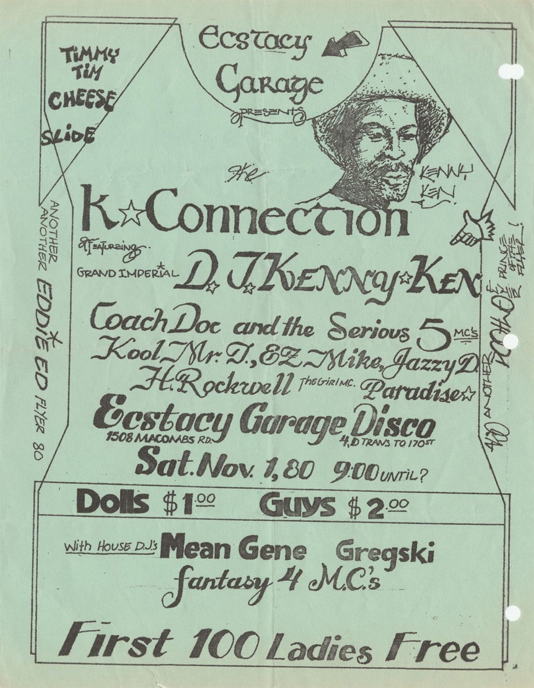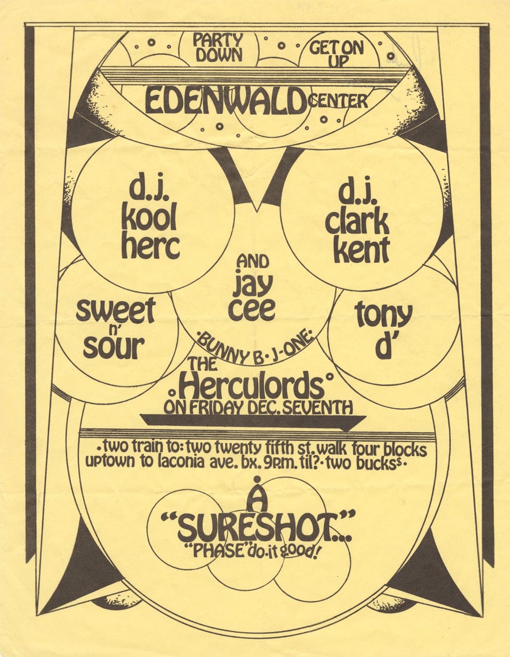 Buddy Esquire—born Lemoine Thompson in 1958—was self-taught. He began his artistic career in 1972 as “Phantom 1,” the tag he painted on the sides of the 2 and 5 trains through the Bronx. That was long before the word “graffiti” was regularly paired with the word “artist,” but the spray-paint practice gave Buddy Esquire an appreciation for letter forms that’s evident from his earliest flyers. Though he’d been a writer—as graffitists were known—Buddy Esquire rejected most of the conventions of graffiti when it came to fliers.